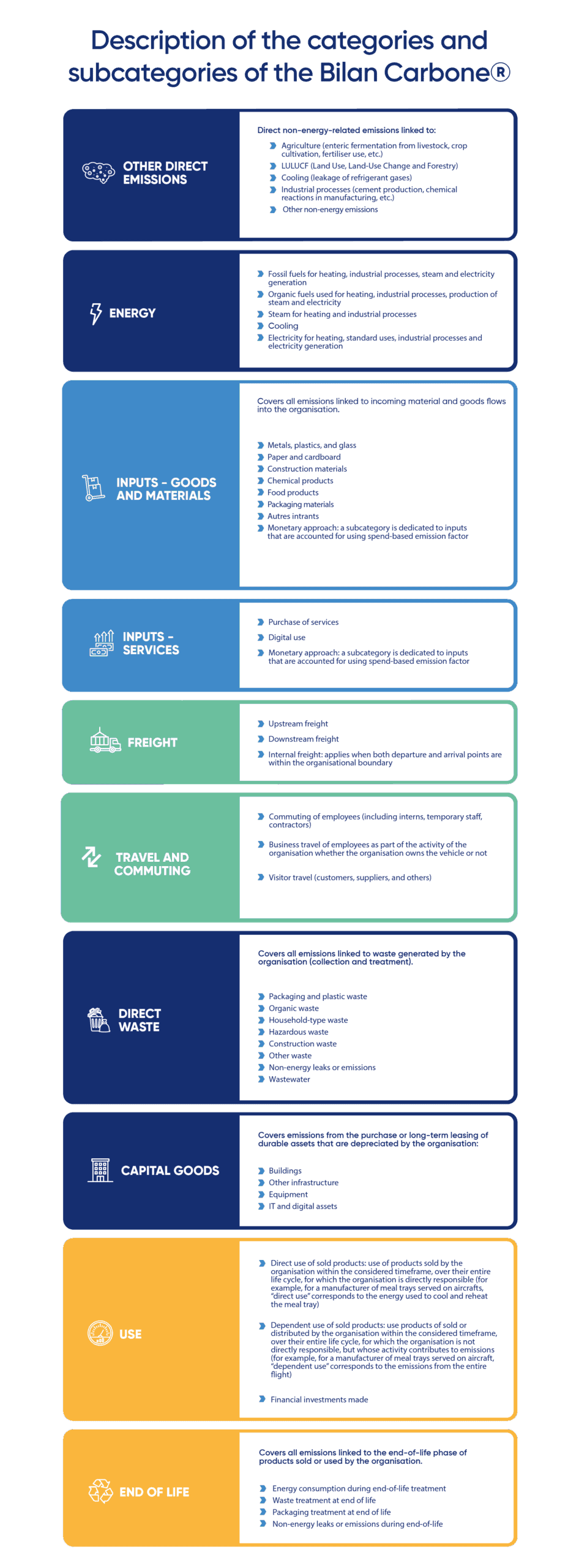 Les sources d'émissions générées par l’activité de l’organisation (directes ou indirectes) sont à ventiler au sein des différents postes d'émissions du Bilan Carbone®.