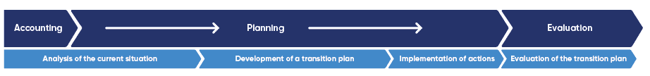 Les démarches de transition bas carbone font progresser les organisations dans leur parcours de transition. Ces démarches, d'une manière générale, suivent un processus structuré en plusieurs étapes clés, présentées dans un « parcours de transition » ci-dessous.